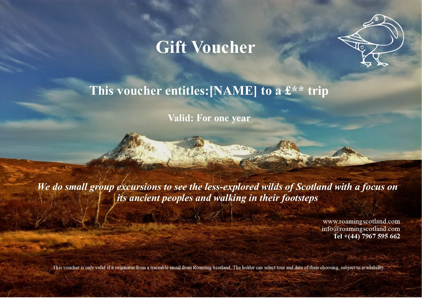 Our voucher enables the purchase of an ‘experience’ with Roaming Scotland to give as a gift.